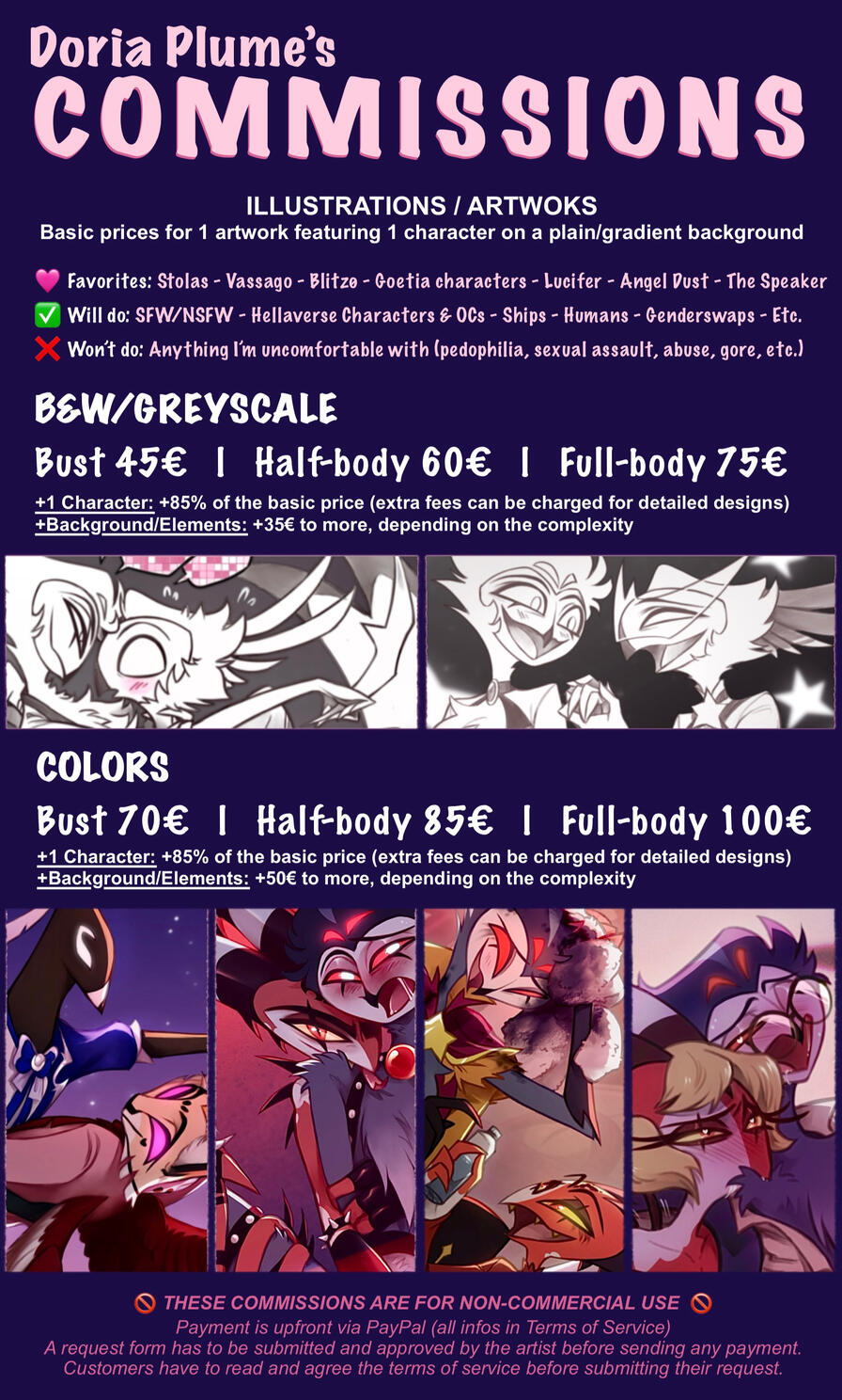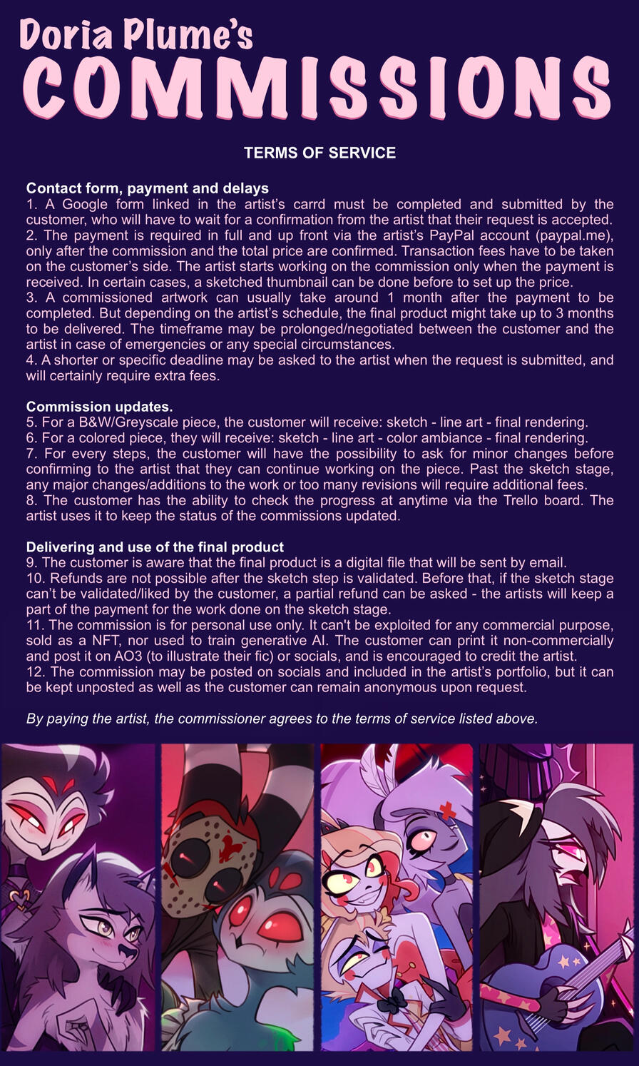 I’m a French artist currently going through a passionate creative obsession for Helluva Boss.Before that, I used to work on original projects from which I’ve been sharing the artworks and concepts for years on socials. The most ancient of them is “La Reine Bleue”, originally shared on Skyblog and DeviantArt (around 2008/2012). Another one you may know is “Sacramentum”, started on 2012/2013 and released as a French Original Webtoon in 2020 (webtoon.fr). Sadly, the publication has to be stopped after 15 episodes due to the burnout that stroke me and the lack of good professional conditions which couldn’t have me going anymore. When I felt better, I decided to rewrite this story as a novel, and it’s been a work in progress since then.Besides, I’m a freelance worker doing illustrations and artworks, as well as infographic missions.